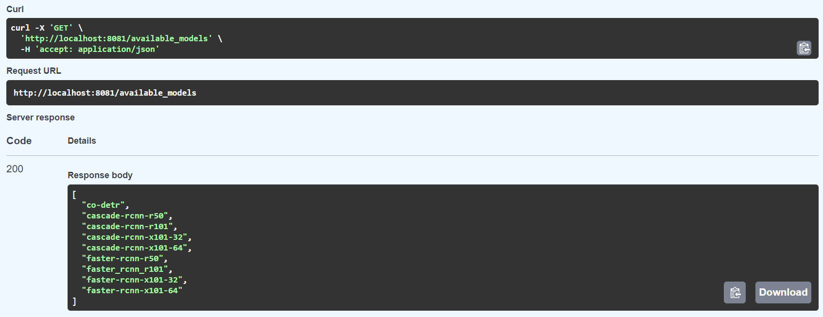 You should then see the response of the REST-API which should be a list of all your keys that are defined in available_models.yml.