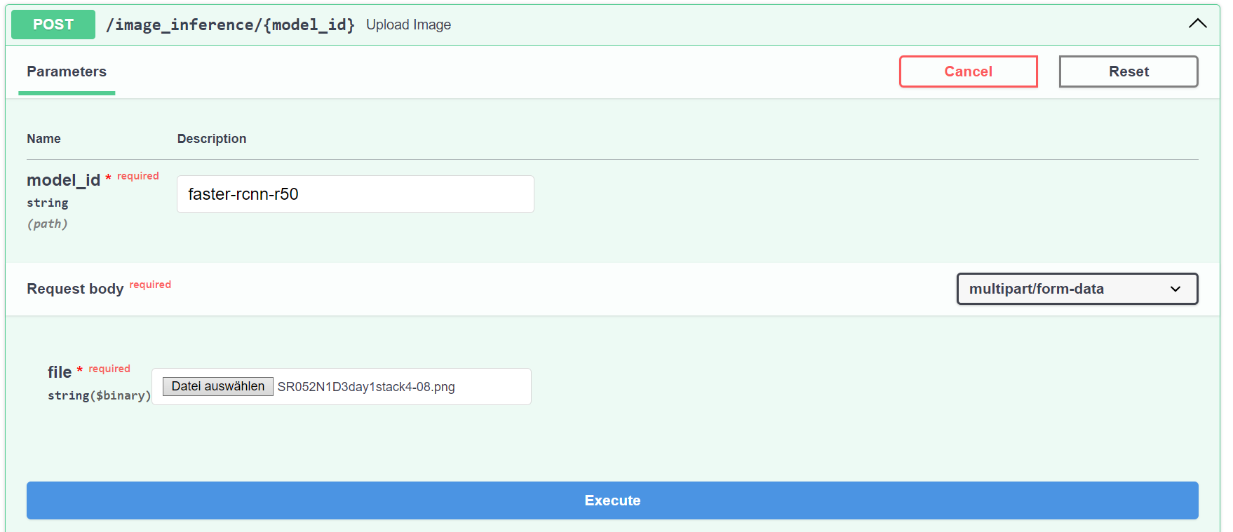 There is a second endpoint the REST-API provides that can accept an image and returns a list of bounding boxes. Click on the POST /image_inference/{model_id} section, then on Try it out. In the model_idfield enter one of the names that were returned by the /available_models endpoint, which should correspond to the keys in available_models.yml. Next click on the file input and select one image that should be sent through the model. Finally click on the Execute button.