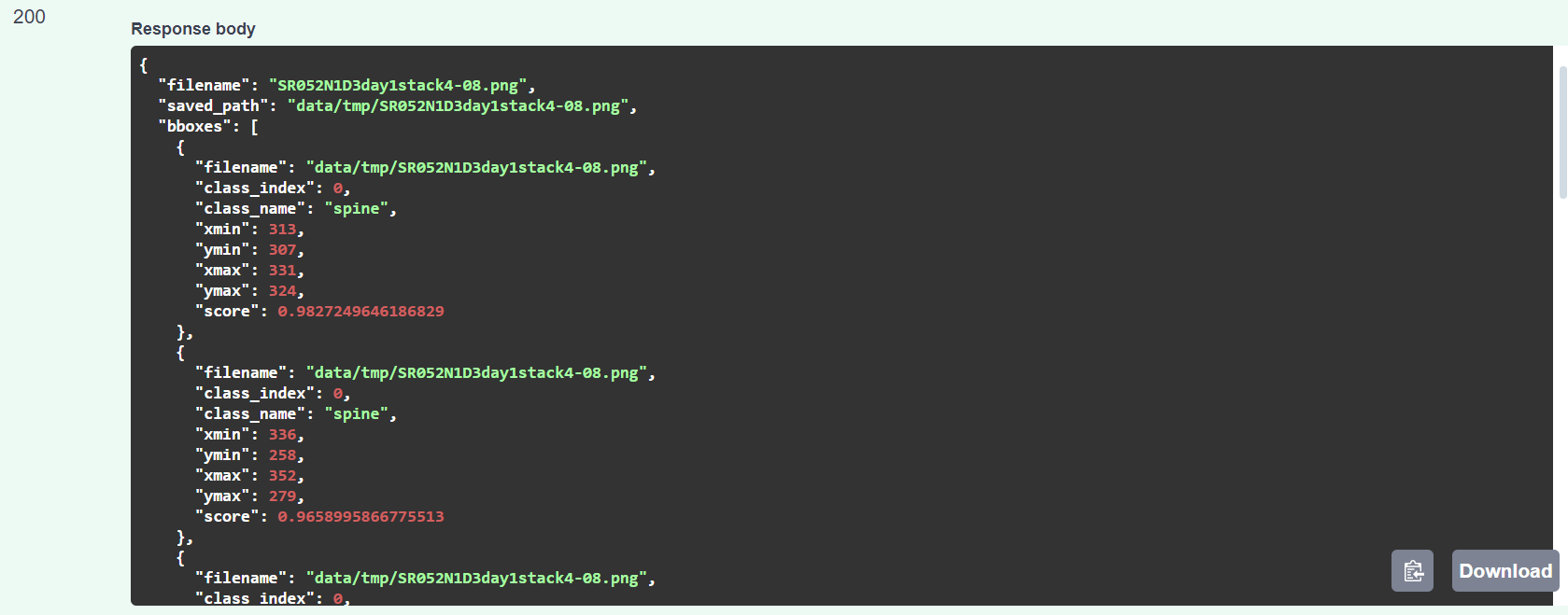 This means when you run the docker environment with the command docker compose up -d a docker container based on the image tnodecode/spine-co-detr is started. It will run on port 8081 on your machine. Also two directories will be mapped into the container. First the available_models.yml file in the root directory of this repository will be mapped to the /app/available_models.yml directory inside of the container. Also the directory ./models of this repository will be mapped to the /app/runs directory inside the container. This means if you have a model weight file on this machine placed in ./models/mmvc/my_weights.pth it will be available in the container under /app/runs/my_weights.pth.
