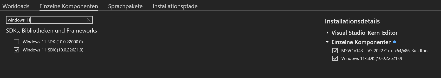 On Windows machines you need to have instaled the Visual Studio Community edition. You can install a compiler by installing the Microsoft Build Tools on your PC (Microsoft Build Tools für C++ - Visual Studio). Switch to the “single compoents” tab in the installer and check the option "Windows 11 SDK" (or "Windows 10 SDK" if you are working with Windows 10).